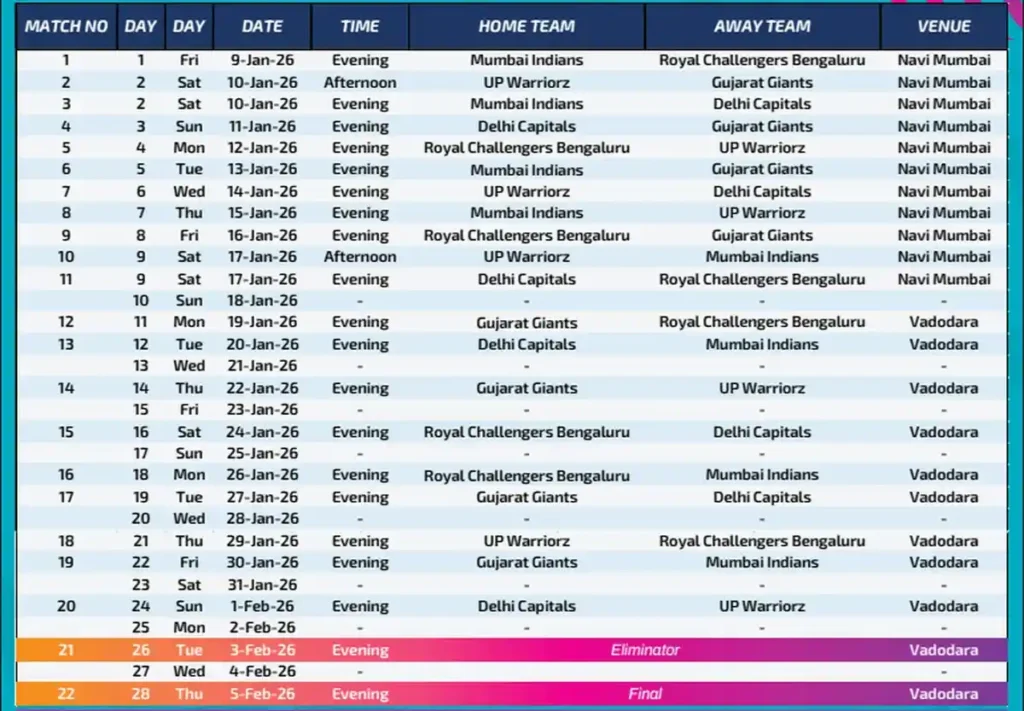 The WPL 2026 schedule runs all the way till February 5 this year. That’s nearly a month of non-stop women’s cricket action for supporters. A total of twenty-two matches will be played across the entire tournament.